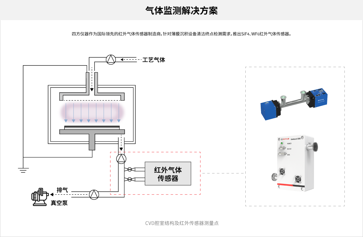 傳統(tǒng)方法依賴經(jīng)驗(yàn)時(shí)間控制,但實(shí)際最佳清潔時(shí)間受沉積厚度、溫度、壓力等因素影響,且參數(shù)可能漂移。因此,多數(shù)工藝會(huì)延長清潔時(shí)間以確保徹底清潔,但造成資源浪費(fèi)。Johnson等(2004)提出通過監(jiān)測SiF?分壓確定清潔終點(diǎn)。紅外氣體傳感器因其高實(shí)時(shí)性和可靠性,已成為主流檢測手段。